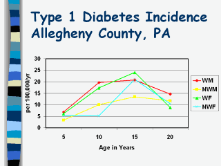 | The next few slides illustrate the descriptive epidemiology of T1D in Allegheny Country, PA. The incidence of T1D is higher among whites than non-whites. There is no difference in incidence by gender. The peak incidence of T1D is at puberty. |
