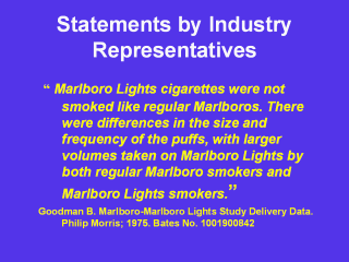 to health. The companies knew that in fact the smokers don’t typically absorb less tar and nicotine from Light cigarettes and cenrtainly that the numbers printed on the packs did not reflect true absorption. However, the companies did nothing to inform consumers of this. They were happy to let consumers be tricked into continuing to smoke light cigarettes (rather than quit), in the false belief that these were less harmful. It wasn’t until decades later (after losing their first product liability lawsuit) that some companies attached “onserts” onto the packs to explain this to consumers. |