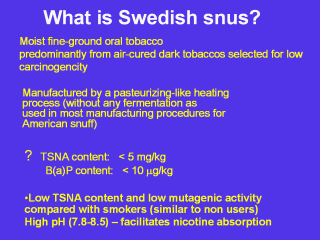 | Low TSNA content due to choice of raw tobacco, curing method and the special manufacturing process (involving a pasteurization-like process rather than fermentation). |