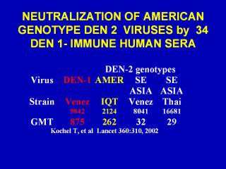| It was discovered that dengue 1 antibodies were able to neutralize virtually all American genotype dengue 2 viruses to high titer. Geometric mean titers observed in 34 dengue 1 sera when tested with and American genotype dengue 2 virus was 1:262 compared with 1:875 versus homologous dengue 1 virus. However, two strains of Asia genotype dengue 2 (one isolated in the Americas and the other in Asia) were poorly neutralized by antibodies to dengue 1. |
