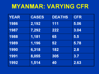 | Significant differences in case fatality rates do not correlate with the number of hospitalizations. Possible explanations include differences in case fatality rates associated with different dengue infection sequences. There were not measured during this period. |