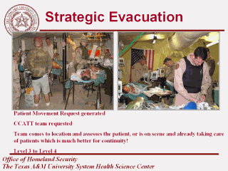 | Strategic Evacuation is done almost entirely by the air force. Patient movement requests are generated. CCATT teams are requested if the patient requires intensive care. The team comes to the location, assesses the casualty and may or may not perform additional procedures such as additional IV placement, intubation, central lines based on assessment of the patients needs to safely make it through the flight. |