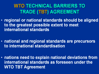 and re-tested when entering foreign markets. Such a principle is beneficial for consumers provided that the one applied standard takes their interests into account and/or meets legal requirements concerning legitimate regulatory objectives such as the protection of human health and the environment. Consequently, such standards ought to respect some basic requirements. - If standards bodies were to produce simultaneously international and regional or national standards, some partiality, incoherence and conflict in the set of international standards could arise. Such a situation would be confusing for businesses, users and public authorities, and the latter would risk creating regulatory barriers if using conflicting international standards as a basis for technical regulation. - To this end, WTO members adopted a set of principles to clarify and strengthen the concept of international standards under the TBT Agreement (6). The WTO accepted principles are: All essential information regarding work planning, work under progress and final results should be made easily accessible to all interested parties and throughout all stages of standards development. Appropriate time and opportunities for written comments should be provided. Any interested national member should be provided with meaningful opportunities to participate in standards development. The standards development process should be conducted in a non-discriminatory way and should not give privilege to, or favour the interests of, a particular supplier or country. Conflicting arguments must be reconciled to satisfy all national members. The international standards development process should take account of market needs, scientific and technological development. It should also consider regulatory needs and pay due respect to consumer concerns, and concerns relating to the health and safety of workers and the protection of the environment. The standards development process should result in a coherent set of international standards that do not conflict with each other. International standards bodies should co-operate and co-ordinate with each other to avoid conflicting international standards. International standardisation should take the constraints on developing countries to effectively participate in standards development into consideration. Provisions for capacity building and technical assistance within international standards bodies should also be considered. WTO/G/TBT/9 of 10 November 2000, and Annex 4 thereof. THE EUROPEAN PRINCIPLES OF GOOD GOVERNANCE IN INTERNATIONAL STANDARDISATION BODIES Within the WTO, there are a number of international standardisation organisations which produce "international standards" within the meaning of the TBT agreement, e.g. the International Maritime Organisation, or the framework of agreements and conventions for international road, rail, inland waterway, and combined transport. These "standards" are developed exclusively amongst Government representatives without direct participation of individual stakeholders to whom they are targeted. There is a potential to enhance the application of European principles of good governance and accountability. The Commission will seek to find opportunities to render the procedures and structures under which these standards are developed more open and transparent. - THE GLOBAL DIMENSION OF STANDARDISATION Global trade continues to increase. The use of international standards can enhance market access and facilitate trade. |