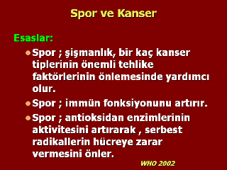 Breast kanserı: kan da olan estrogenin yüksek düzeyi kadınların cinsi sisteminin kanserının tehlikesın artiryior; Spor kanda olan estrogenin düzeyin azaldır, böylece tehlikeyi azaldır.