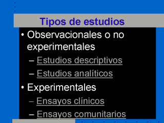 | Para simplificar la gran diversidad de estudios existentes se han clasificado en dos grandes grupos: observacionales y experimentales.