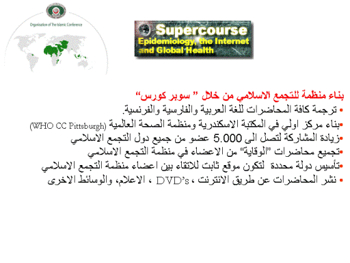 منظمة التجمع الاسلامي لها اهميتها، وللوصول الى تحقيقها نحن بحاجة الى من يستطيع ان يترجم المحاضرات الخاصة بها الى اللغة العربية والفرنسية . نحن نقوم بذلك لاننا نؤمن بان هذه المحاضرات لا يجب ان توظف لمن يعملون في مجال الصحة فقط بل يجب ان تصل الى الزملاء الآخرين الذين يعملون في تخصصات اخرى كعلم المناعة، التاريخ، التعليم الاكاديمي، التغذية ، التمريض.الخ. لذلك محاضراتنا ليست مقتصرة على الاخصائيين ، بل لجميع من يعمل في مجال التعليم العالي. المركزين الرئيسين المنظمين سيكونان مكتبة الاسكندرية في مصر و والمركز التعاوني مع منظمة الصحة العالمية . اكثر المحاضرات بروزا تلك التي انتجت في ايران ، لدينا محاضرات بارزة حول ” تطوير الابحاث“  من قطر. هذه الانواع من المحاضرات ساعدت في عملية التعلم  لعيد من الطلاب في الصين  ، اميركا، اوروبا وامريكا اللاتينية . سوف نستخدم شتى الوسائل والطرق  لنشر هذه المحاضرات من خلال المنطقة الاقليمية لمنظمة التجمع الاسلامي لاهميتها كونها الجسر الحيوي الذي يوصل الانقسامات.
