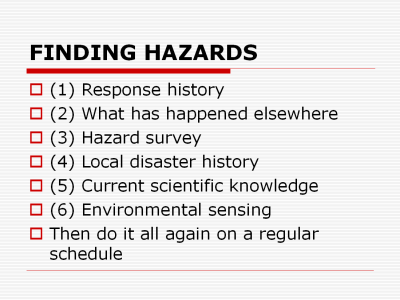Fourth, study local disaster history. Sources of data include newspaper files, local histories, the historical society, and monuments (data on the flood history may be recorded by a marker on a building that marks the water level of the big one). Fifth, contact researchers. A town built along a river bank with bluffs to its rear is obviously in a flood plain. However, weather patterns, insect infestations, potential for wildfire development, fault lines, the potential for subsidence, etc., can be addressed by specialists.Sixth, establish a process for environmental sensing to continually update the assessment. Change in transportation, industrial and urban development, population densities, etc. is constant. |