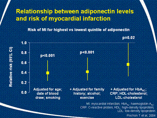 Low adiponectin levels were associated with a higher risk of MI. This increased risk remained