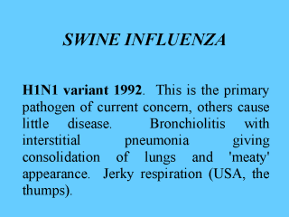 and epidemiology: The HIN1 variant entered the UK in elite dutch pigs. The pigs had appeared negative by MAFF HI tests because the H1 virus was different to the H1 test virus. The virus recycles on a farm because litters of pigs become susceptible once their maternal antibodies have waned. Pigs are also the source of new reassorted mammalian subtypes because they occasionally become co-infected with avian and human viruses at the same time. This occurs in China. Pigs are also believed to have started the massive flu pandemic in Nov 1918. Frozen mass graves in Alaska have been used to obtain these 1918 isolates or their RNA to investigate this hypothesis. |