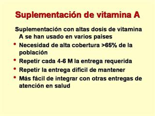 India - a los 9-12 M dar una elevada dosis en la inmunización contra el sarampión y posteriormente cada 6 M después de chequeos regulares Bangladesh – abastecimiento de baja dosis de 25000 a 50000 UI (unidades internacionales) con vacunas rutinarias en el 1er año de vida y posteriormente en días especiales |