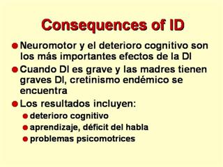 En deficiencia de yodo menos severa, efectos neurológicos van desde cambios neurológicos detectables hasta afectación de la capacidad de aprendizaje y rendimiento escolar, o disminución de la capacidad para manejar las pruebas formales de las funciones psicomotoras. Lecturas: Stanbury ed., El cerebro dañado por la carencia de yodo. 1994, NY, Cognizant communications Meta-análisis de 18 estudios que abarcan 2.214 personas indica que las personas tienen un DI con puntuación promedio de IQ 13,5 puntos inferior a las personas de yodo suficiente |