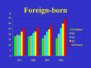 percentage of population in each quintile that was born outside of Canada. From 1971 to 1996, that percentage diminished in the richest quintile, but increased in the poorer quintiles. By 1996, over a third of the population of the poorest quintile was foreign-born, compared to about a quarter of the population in 1971. This is important because the mortality of immigrants, especially recent immigrants, is known to be lower than that of the Canadian-born population. |