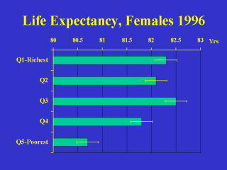 | For females, life expectancy in Canada's poorest urban neighbourhoods (80.7) was 1.3 years higher than the national average life expectancy for females in the United States (79.4). |