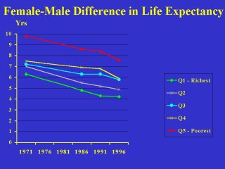 successively poorer income quintile. However, in all quintiles, the difference in life expectancy between males and females diminished between 1971 and 1996.