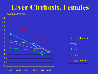 Yet another success story is for liver cirrhosis among females, where income-differentials in mortality appear to have been eliminated.