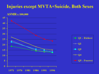 | For injuries except motor vehicle accidents and suicide—that is to say, for falls, poisoning, drowning, fires and so forth—the differences by income narrowed considerably, but the poorest quintile continued at a relatively great disadvantage. |