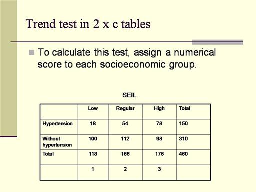 Then, we should calculate the mean scores in each of two categories of the binary variable. With hypertension = (1 x18) + (2 x 54) + (3 x 78)/150= 2.4 Without hypertension = (1 x 100) + (2 x 112) + (3 x 98) /310 =1.99 In addition we need to calculate the overall mean score and standard deviation for the scores of the two groups. Overall mean score = (1 x 118) + (2 x 166) + (3 x 176)/460 = 2.13 S= √(1-213)2 + (2-2.13)2 + (3-2.13)2 / 460-2 = 0.067 |