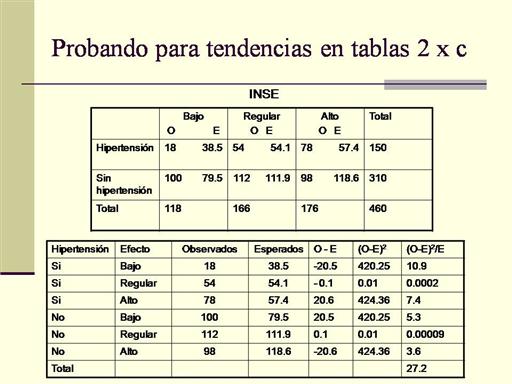 La prueba de Chi cuadrada sin corregir es de 27.20 con 2 grados de libertad p<0.001. ¿Cómo interpretamos este resultado? Estamos interesados en si la proporción de hipertensos se incrementa o disminuye a través de los grupos de nivel socioeconómico. Para poder responder esto, necesitamos una prueba de Chi cuadrada para tendencias. |