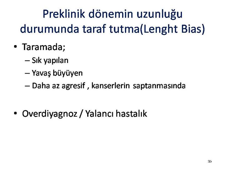 Many of these tumors fulfill the histologic criteria of cancer but will never become clinically significant or cause death. This problem is compounded by the fact that the most common cancers appear most frequently at ages when competing causes of death are more frequent. Hızlı büyüyen tümörler, hızla bir preklinil evreden geçeceklerinden taramalarda daha az rastlanabileceklerdir. Bu nedenle, sık yapılmayan taramalarda iyi gidişli bir çok yavaş büyüme gösteren tespit edilecektir. Bunun bir sonraki aşaması yalancı hastalık Length bias: Mammography detects a cancer while it is preclinical, and preclinical durations vary. Cancers with longer preclinical durations are more likely to be detected by screening; these cancers tend to be slow growing and to have good prognoses, irrespective of screening.