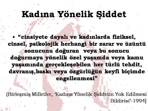 “cinsiyete dayalı ve kadınlarda fiziksel, cinsel, psikolojik herhangi bir zarar ve üzüntü sonucunu doğuran veya bu sonucu doğurmaya yönelik özel yaşamda veya kamu yaşamında gerçekleşebilen her türlü tehdit, davranış,baskı veya özgürlüğün keyfi biçimde engellenmesi” |