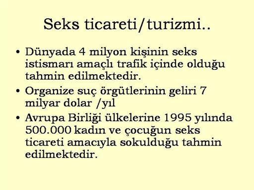 Dünyada 4 milyon kişinin seks istismarı amaçlı trafik içinde olduğu tahmin edilmektedir. Organize suç örgütlerinin geliri 7 milyar dolar /yıl Avrupa Birliği ülkelerine 1995 yılında 500.000 kadın ve çocuğun seks ticareti amacıyla sokulduğu tahmin edilmektedir.