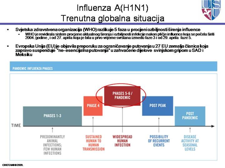 WHO Definicija faza 4. Faza – odlikuje je verificirana transmisija sa čovjeka na čovjeka tipa animalne ili humano- animalne influence reasortiranim virusom koji je sposoban da uzrokuje “lokalizovano zajedničko širenje infekcije” (primjer: mali klasteri bolesti 25 humanih slučajeva koji traju do dvije sedmice) .” Sposobnost lokalizovanog širenja zjedničke infekcije stvara uslov za razvoj pandemije. Svaka zemlja koja ima vjerovatne ili verificirane takve slučajeve treba se urgentno konsultovati sa WHO tako da se situacija procijeni udruženo. Faza 4 indicira signifikantan rastući rizik od razvoja pandemije ali ne znači neophodnu pojavu pandemiju u zaključku. Faza 5 je karakteristična po širenju virusa sa čovjeka na čovjeka u najmanje dvije zemlje u WHO regionu (25-50 slučajeva koji traju 2-4 sedmice). Dok većina zemalja nije zahvaćena ovom fazom, deklaracija o fazi 5 zahtijeva strogu signalizaciju prijetnje za razvoj pandemije i traži finalizaciju organizacije, komunikaciju i implementaciju mjera za suzbijanje bolesti. Faza 6, je faza pandemije, karakterizirana epidemijom u najmanje jednoj ili drugim zemljama WHO regiona uz korištenje kriterija definisanih u fazi 5. in addition to the criteria defined in Phase 5. Neophodno je preuzimanje svih mjera za sprečavanje širenja pandemije širih razmjera. |