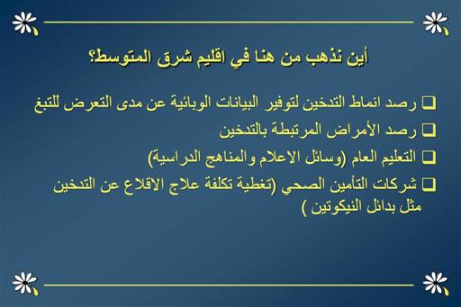 قامت منظمة الصحة العالمية بايجاد آلية لرصد تعاطي التبغ (التدخين) في العالم Global Tobacco Surveillance System (GTSS) ومحاورها كالآتي: اليافعين من سن 13- 15 GYTS المُدرسين والاداريين في المدارس GSPS طلاب طب الاسنان والطب والتمريض والصيدلة GHPSS البالغين GATS
