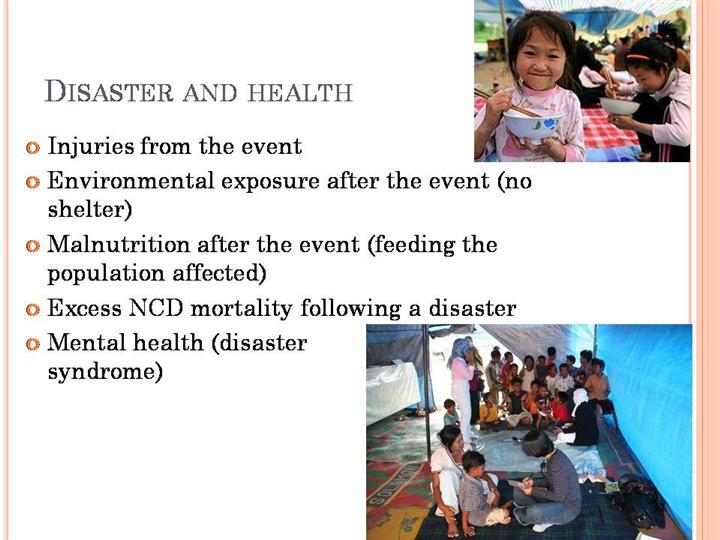 Disasters consequences range between short and long-term. Effective assessment can establish the base for appropriate actions. This can serve well in lessening the burden of disaster and enhancement of coping. Nursing education acknowledges mental wellness by itself an outcome , however, it is also looked as the key for physical well being.