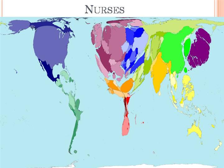 Geography is modified by the relative size of the nursing population in these bubble charts. According to the size of the bubbles, there are more nurses in the developed countries. |