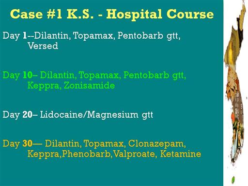 As other agents were added, we kept trying to establish therapeutic levels on the AED’s, many days required boluses and increases in maintenance doses |