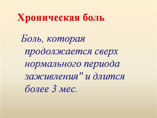 Хроническая боль - это боль, которая перестала зависеть от основного заболевания или повреждающего фактора и развивается по своим законам. Международная ассоциация по изучению боли определяет ее как "боль, которя продолжается сверх нормального периода заживления" и длится более 3 мес. По критериям DSM-IV хроническая боль длится не менее 6 мес. Главным отличием хронической боли от острой является не временной фактор, а качественно иные нейрофизиологические, биохимические, психологические и клинические соотношения. Хроническая боль является излюбленной маской скрытой депрессии. Тесная связь депрессии с хронической болью объясняется общими биохимическими механизмами.