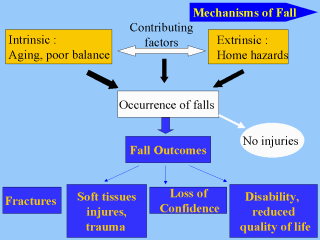 | A fall is not usually caused by a single factor. Most falls by older persons result from the numerous, or complex interaction of intrinsic ( personal or host) factors, and extrinsic (environmental) factors. In other words, the likelihood of a fall, or injury from a fall is dependent on the characteristics that are inherent in individuals as well as environmental hazards. It is also related to the result of body changes by aging, disease or medication and changes of activity levels. |