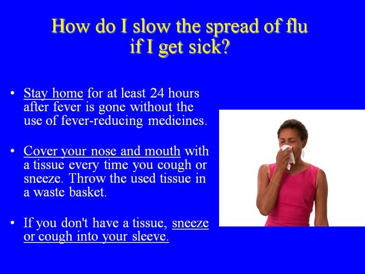 Public Health recommends that you use the same precautions to prevent others from getting H1N1 flu as you would for seasonal flu: Stay home for 7 days after your symptoms begin and avoid contact with other people Cover your nose and mouth with a tissue every time you cough or sneeze. Throw the used tissue in a waste basket. If you don't have a tissue, sneeze or cough into your sleeve. |