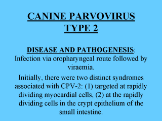 death in 3 - 8 week-old puppies. This presented as sudden death or as a "fading puppy syndrome". The virus had a predilection for myocardial cells where intranuclear inclusion bodies developed. Heart failure resulted and this could be sudden in onset and fatal. Partial heart failure resulted in poor exercise tolerance and pulmonary oedema. This disease pattern has largely disappeared because maternal immunity is now common in the dog population. (2) Enteritis in dogs > 8 week-old. Serious shortening of the villi occurs because of viral destruction of crypt epithelial cells. Initially, a grey, persistent, foul-smelling diarrhea was associated with infection. More recently, haemorrhagic lesions are found. Morbidity high; mortality around 10%. The former syndrome appears more rarely now, probably due to widespread passive maternal immunity. |