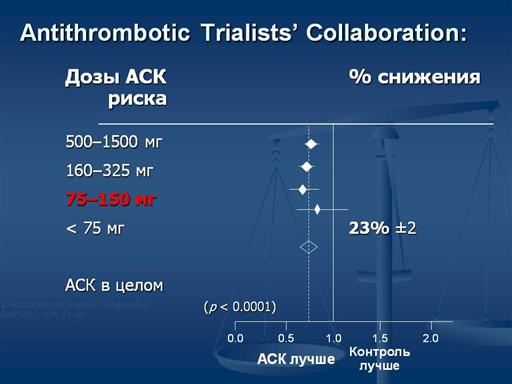 Основной вывод из этого исследования - Низкие дозы АСК (75–150 мг в сутки) более эффективны, чем высокие дозы при длительном применении. Кроме того было показано, что антагонисты АДФ-рецепторов - единственная группа антиаггрегантов, которые продемонстрировали преимущество над АСК в снижении риска ССЗ. Дополнение второго антиаггреганта к АСК может вызывать дополнительные преимущества – на 33% снижение риска инсульта например. |