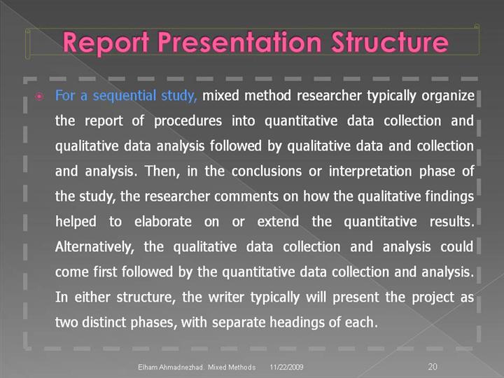 The structure for the report, like the data analysis, follows the type of strategy chosen for the proposal study. Because mixed methods studies may not be familiar to audiences, it is helpful to provide some guidance as to how the final report will be structured.