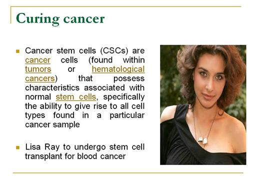 Times – Wednesday 18th November, 2009 – (IANS) Toronto-born Lisa made this announcement Tuesday while visiting the Marshall McLuhan Catholic Secondary School where her film ‘Water’, directed by Deepa Mehta, was screened. Ray, who was born to a Polish mother and Bengali father, said the process for a stem cell transplant would begin next week in a city hospital. The procedure would begin by releasing her own stem cells into her blood, then collecting them and later freezing them, she said. Calling it a ‘reboot’ of her system, she said the process would take up to two weeks to complete. After this, she would put on a waiting list for a stem cell transplant. |