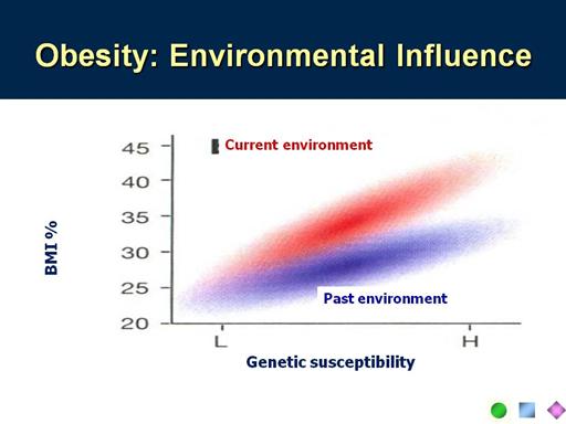 What is responsible for this sudden increase in the number of obese people in the U.S.? Obesity most likely results from an interplay between genes and the environment. However, the recent explosion in the prevalence of obesity has occurred too quickly to be explained solely by changes in our genes. One hypothesis is that, in the past, humans who were able to accumulate fat when food was plentiful were better able to survive during times of food scarcity. Now, however, in the U.S. and many other countries, food is plentiful and foods that are high in calories but often low in nutritional value tend to be relatively inexpensive. Furthermore, most people engage in far less physical activity than did previous generations. Ironically, the ability to accumulate fat during times of plenty – which was originally thought to confer a benefit – has become a detriment to our health. Research supported by the NIDDK has led to improved understanding of the factors contributing to this complex condition.