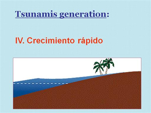 “IV.Crecimiento rápido: es una medida de la altura del agua de la costa observada en cuanto al nivel del mar. Como la onda del tsunami viaja de aguas profundas, la pendiente continental está cerca de la región cerca de la costa y crecimiento rápido del tsunami ocurre”.