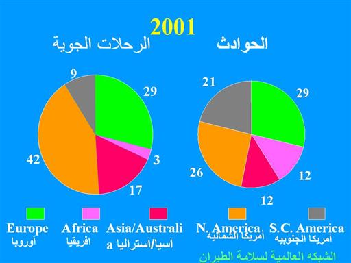 | معظم الحوادث التي وقعت في عام 2001 كانت في أوروبا وأمريكا الشمالية ، مما يعكس وجود عدد كبير من الرحلات الجوية في هذه القارات. عندما ينظر اليها فيما يتعلق بتوزيع جميع الرحلات الجوية ، جنوب أفريقيا وأمريكا الوسطى كانتا نسبيا أكثر حوادث في عام 2001 |