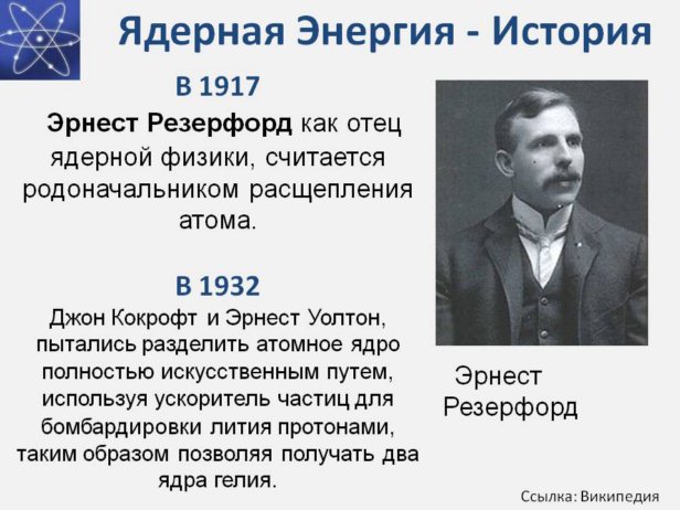 http://en.wikipedia.org/wiki/Nuclear_power#History Отец ядерной физики nuclear physics, Ernest Rutherford Эрнест Резерфорд, считается родоначальником расщепления атома splitting the atom в 1917. Его команда в Англии бомбардировала азот естественными альфа-частицами от радиоактивного материала и открыла излученный протон с энергией выше, чем у альфа-частицы. В 1932 двое из его студентов John Cockcroft и Ernest Walton, работая под руководством Резерфорда, пытались разделить атомное ядро atomic nucleus полностью искусственным путем, используя ускоритель частиц для бомбардировки лития lithium протонами, таким образом позволяя получать два ядра гелия.