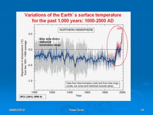 One thousand years of little change-then dramatic increase in temperature in the 20th century. Human activity seems to be the most likely cause….and human activity with an increasing consumerist lifestyle