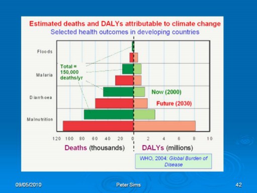 Global warming will significantly increase death rates from infectious disease within 2 decades. It is estimated that there will be at least 150,000 more deaths from Malaria, Diarrhoeal diseases and Malnutrition consequent upon climate change