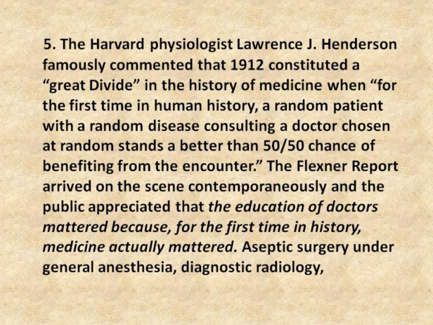bacteriology, clinical chemistry, and a rapidly developing pharmacopeia meant that educated physicians could actually affect the lives of the average citizen and, therefore, citizens finally had a stake in the education of doctors. In the same way that educated classes of society only began to donate their bodies for medical school anatomical dissection when social elites decided that medical education mattered, the politically powerful only began to care about medical education when the quality of that education had the potential to affect them and their children. The Flexner Report arrived at the right place and at the right time.