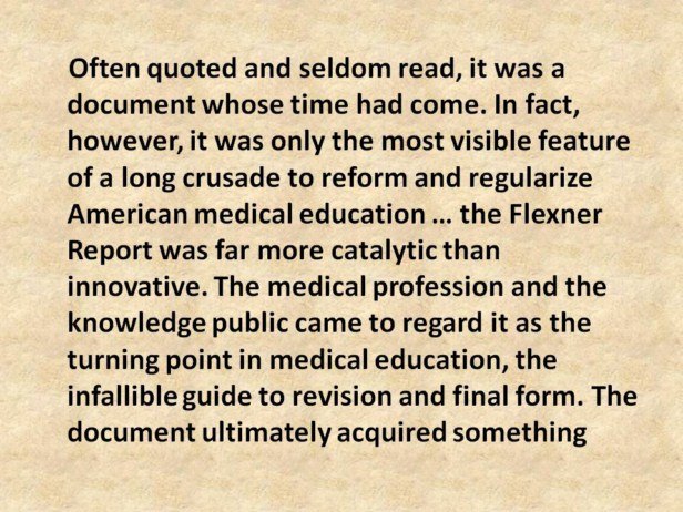 like Talmudic status. To cite it was de riguer; to criticize it unthinkable. And despite the very clear message of the record itself, all manifestations of change that became visible after the turn of the century were attributed to Abraham Flexner … and his Report.