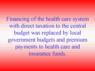 | Health care funds were to be publicly subsidized and administered by local government agencies and could receive credit from banks. The provision that permitted financing with bank credit, however, undermined the principle of developing a coherent, self-financing health market and a balanced health care budget, insofar as any budget deficit or deficit spending could be covered by government loans. |