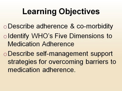 Following this presentation you will be able to: Describe adherence & co-morbidity Identify WHO’s Five Dimensions to Medication Adherence Describe self-management support strategies for overcoming barriers to medication adherence.