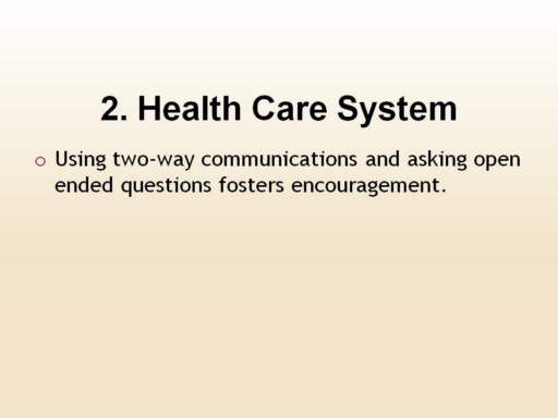 Interactive two-way communication amongst health care providers and the patient is critical to successful medication adherence. Effective communication fosters encouragement and provides reinforcement.19 Using open-ended questions and a non-judgmental voice tones allows for more information to be exchanged. Allowing patients to verbalize their questions and have their questions answered is crucial for medication adherence.