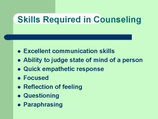 | Counseling is a dynamic process. The counselor has to quickly understand the clients state of mind, his/her concerns, worries, level of confidence and ability to cope with crisis. And the counselor has to proceed accordingly. The counselor may have to change his/her approach as per the client's response. The counselor should appear to be actively participating in understanding the client's dilemma by reflection of feeling, questioning and paraphrasing. |