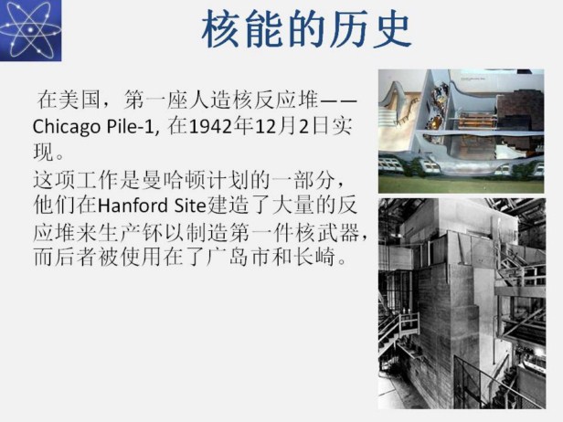 在费米和西拉德移民至美国后,美国有了第一个人造核反应堆,也就是芝加哥堆-1。该反应堆与1942年12月2日达到临界。这一工作成为了曼哈顿计划的一部分。曼哈顿计划在汉福特基地(之前是华盛顿的汉福特镇)建立了几个大反应堆来生产钚以用于最早的核武器,这些核武器曾用于广岛和长崎。富铀化是当时的另一主要工作。